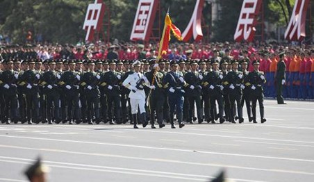 10月1日,首都各界慶祝中華人民共和國成立60周年大會在北京舉行。這是三軍儀仗隊開始行進。