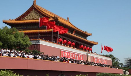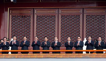 10月1日,首都各界慶祝中華人民共和國成立60周年大會在北京天安門廣場隆重舉行。這是胡錦濤、江澤民、吳邦國、溫家寶、賈慶林、李長春、習(xí)近平、李克強、賀國強、周永康在天安門城樓上。