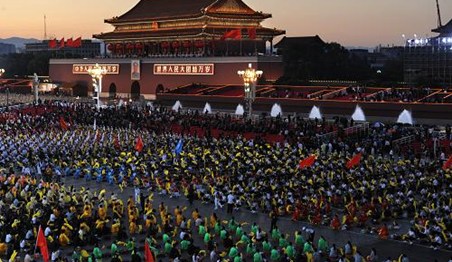10月1日,首都各界慶祝中華人民共和國成立60周年大會在北京舉行。這是“國旗”方陣、“國徽”和“國慶、年號”方陣通過天安門廣場。
