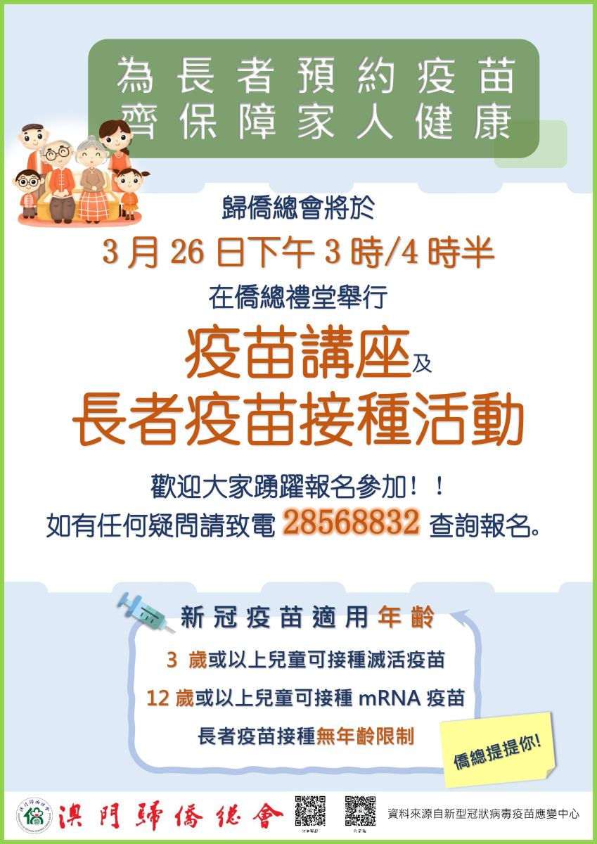 鄰近地區(qū)疫情反覆不定,防疫工作不容忽視。防控疫情,人人有責。結(jié)合海內(nèi)外防疫經(jīng)驗,疫苗在當前被證明最能有效降低重癥發(fā)生機率和傳播風險的辦法,本會期望透過專題講座讓長者更深入和全面了解接種新冠疫苗重要性,增強認知,減少疑慮。
