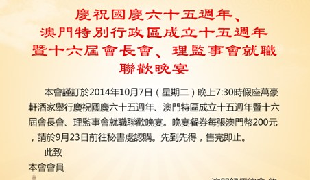 本會(huì)謹(jǐn)訂於2014年10月7日(星期二)晚上7:30時(shí)假座萬(wàn)豪軒酒家舉行慶祝國(guó)慶六十五週年、澳門特區(qū)成立十五週年暨十六屆會(huì)長(zhǎng)會(huì)、理監(jiān)事會(huì)就職聯(lián)歡晚宴。