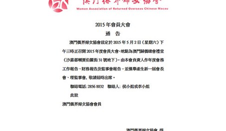 澳門僑界婦女協(xié)會(huì)茲定於2015年5月2日(星期六)下午三時(shí)正召開2015年度會(huì)員大會(huì),地點(diǎn)為澳門歸僑總會(huì)禮堂(沙嘉都喇賈伯麗街31號(hào)地下)。