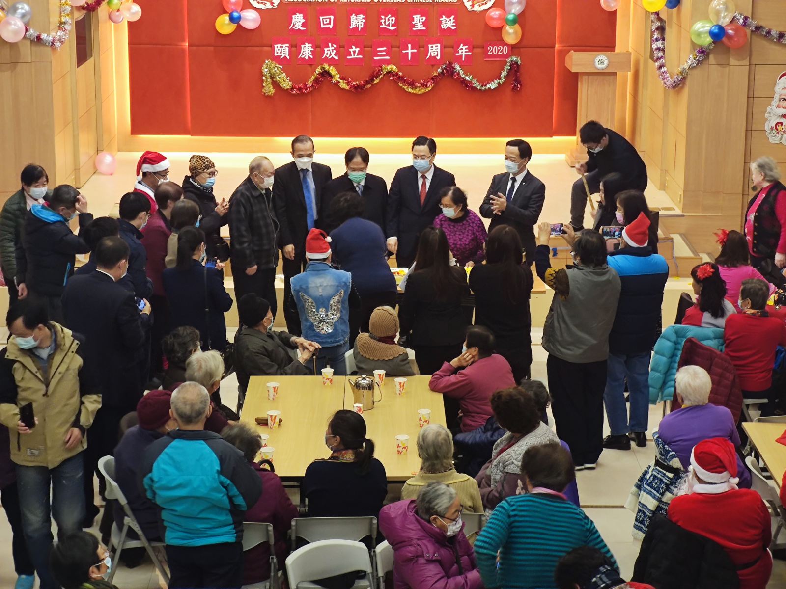 全國僑聯(lián)副主席程學(xué)源,僑總會長劉藝良,理事長王彬成,監(jiān)事長劉雅煌,副會長邱漢榮、康寧英、梁寶卿、溫深文、梁美滿、洪華、陳和標(biāo)、王國蓉、廖麗瓊、邢榮發(fā),副理事長陳曉東、吳茵娜,會員拓展部副部長潘婉怡,文康部長陳麗莎與近百名歸僑長者共聚,賀回歸,迎聖誕。程學(xué)源及劉藝良分別代表中國僑聯(lián)及僑總向各位長者表示慰問。