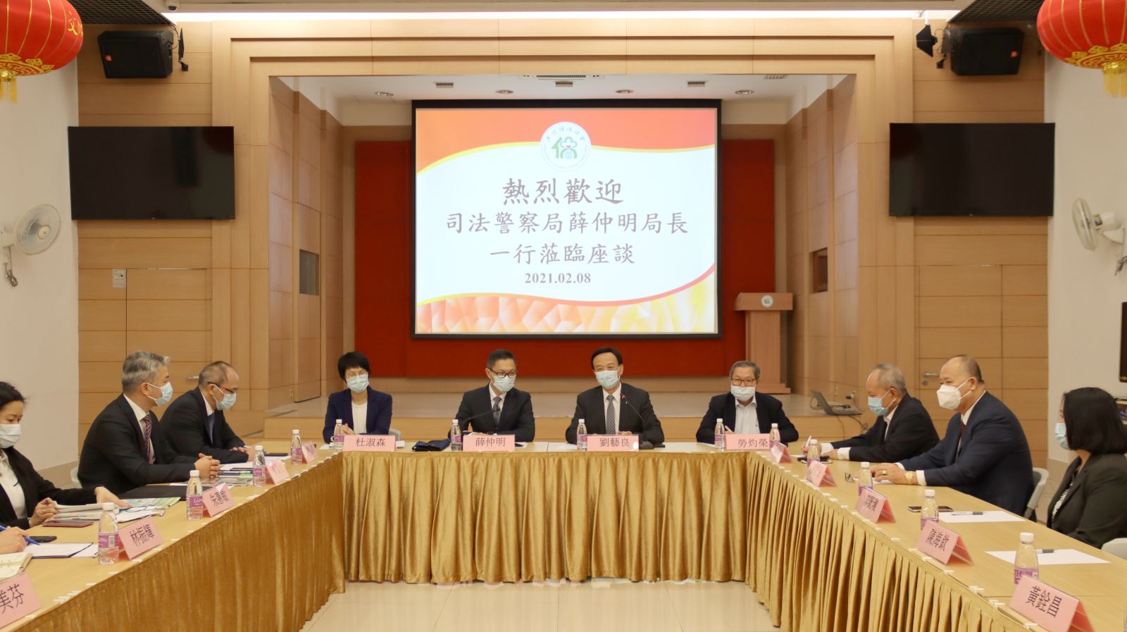 為確保新春假期期間的社會治安秩序良好,讓居民平安歡度佳節(jié),司法警察局在警察總局統(tǒng)籌下開展一系列冬防工作。2 月8 日,司警局局長薛仲明、兩位副局長杜淑森及陳堅(jiān)雄,社區(qū)警務(wù)及公共關(guān)係處處長鄭寶湘率領(lǐng)多名主管人員拜訪澳門歸僑總會,與僑總會長劉藝良,常務(wù)副會長勞灼榮,副會長黃瓊成、張志民、廖麗瓊、黃銓昌、陳海欽等僑總負(fù)責(zé)人進(jìn)行座談交流,共商深化警民合作,防範(fàn)罪案發(fā)生。