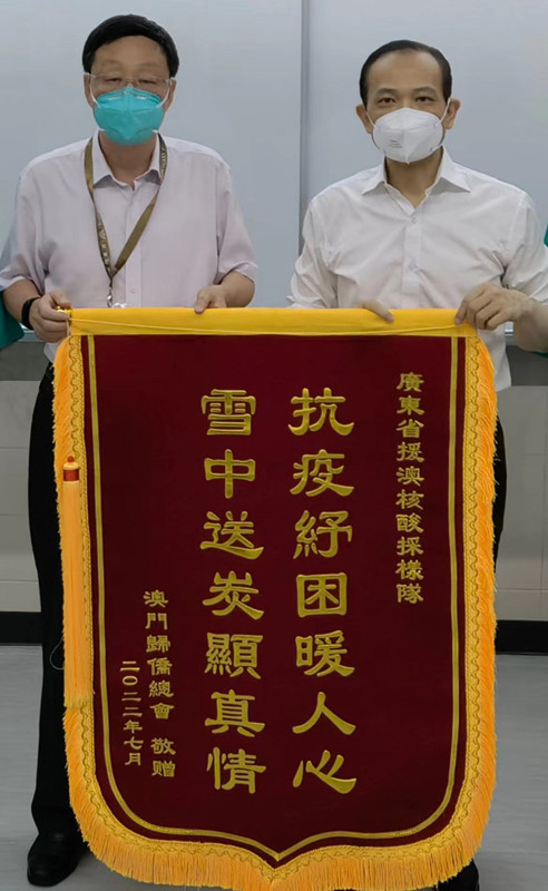 廣東省援澳核酸採樣隊(duì)在抗疫的關(guān)鍵時期馳援澳門,援澳核酸採樣全體隊(duì)員的工作效率和服務(wù)態(tài)度得到了澳門中聯(lián)辦、特區(qū)政府和澳門市民高度評價。澳門歸僑總會日前向援澳醫(yī)療隊(duì)總領(lǐng)隊(duì)、珠海市衛(wèi)生健康局副局長柴宏亮等致送紀(jì)念錦旗,致以最衷心謝意。柴宏亮介紹採樣隊(duì)的工作情況,並感謝僑總及各界對採樣隊(duì)的關(guān)心、支持和幫助,同時指出澳門新一輪疫情爆發(fā)後,採樣隊(duì)與特區(qū)政府協(xié)同聯(lián)動,不斷優(yōu)化核酸採樣流程和工作安排,並與社會各界包括僑總組織的義工隊(duì)互相配合、並肩作戰(zhàn),經(jīng)過共同努力,澳門疫情防控工作順利迎來拐點(diǎn),充分體現(xiàn)“粵澳一家親、攜手同抗疫”的精神。