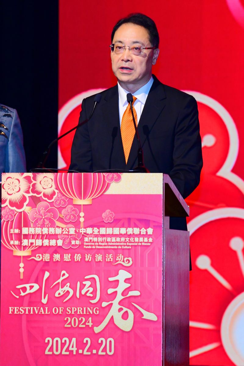 朱柳致詞稱,“四海同春”藝術(shù)團(tuán)慰?jī)S訪演已走過了十五個(gè)年頭,每年春節(jié)都會(huì)組派國(guó)家級(jí)高水準(zhǔn)藝術(shù)團(tuán),分赴全球五大洲及港澳地區(qū)開展慰?jī)S演出,和港澳同胞、海外僑胞一起過年,也帶來祖國(guó)和家鄉(xiāng)關(guān)愛、牽掛和思念,同時(shí)讓大眾感受中華文化和鄉(xiāng)情。在新一年,中國(guó)僑聯(lián)與澳門僑界將繼續(xù)增強(qiáng)澳門僑界的家國(guó)情懷和傳承愛國(guó)愛澳精神,堅(jiān)定擁護(hù)“一國(guó)兩制”,堅(jiān)決支持特區(qū)政府依法施政,積極發(fā)揮澳門僑界融通中外優(yōu)勢(shì),對(duì)外講好中國(guó)故事、講好澳門故事,助力澳門融入國(guó)家發(fā)展大局。