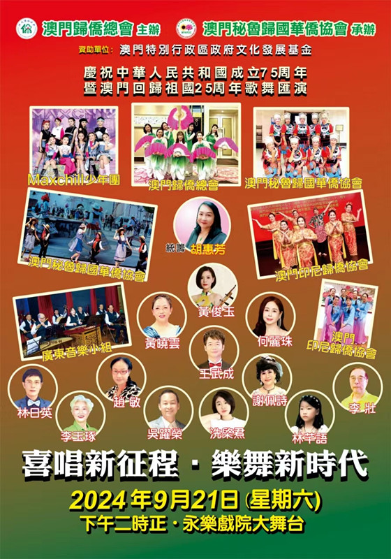 為慶祝中華人民共和國成立七十五周年、澳門回歸祖國二十五周年,同時配合特區(qū)政府構(gòu)建以“中華文化為主流,多元文化共存”交流合作基地的施政,由澳門歸僑總會主辦,澳門秘魯歸國華僑協(xié)會承辦,澳門文化發(fā)展基金資助的“喜唱新征程?樂舞新時代”澳門僑界慶澳門回歸 25 周年之愛國愛澳歌舞大匯演將於9月21日(星期六)下午2時,假澳門永樂戲院1院隆重舉行。傳承僑界“愛國愛澳愛僑愛鄉(xiāng)”之優(yōu)良傳統(tǒng),延續(xù)情系桑梓的美好品格。僑界愛國愛澳大匯演結(jié)合本澳與內(nèi)地僑鄉(xiāng)的各表演者,共同歌頌與舞出對國家、對澳門的“僑心僑情”,增加澳門市民對僑鄉(xiāng)文化的認(rèn)識,促進澳門多元交化交流,活動融入歌舞匯演等形式,開展具有僑特色的多元人文交流,凝聚僑心,相互促進,共譜愛國愛澳愛僑的美好樂章。