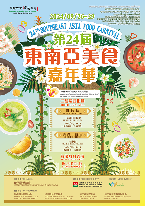 “第二十四屆東南亞美食嘉年華”於本月26日至29日期間在三盞燈圓形地及光復(fù)街舉行,屆時(shí)將設(shè)東南亞國家著名景點(diǎn)圖片展、東南亞沿線國家風(fēng)情歌唱、舞蹈表演及特色美食攤位,期望透過聚焦東南亞美食,糅合東南亞“特色店”品牌,積極拓展內(nèi)地和國際客源,吸引居民和海外旅客前往新橋和三盞燈區(qū)消費(fèi),提振社區(qū)經(jīng)濟(jì),鞏固澳門世界旅遊休閒中心的地位。