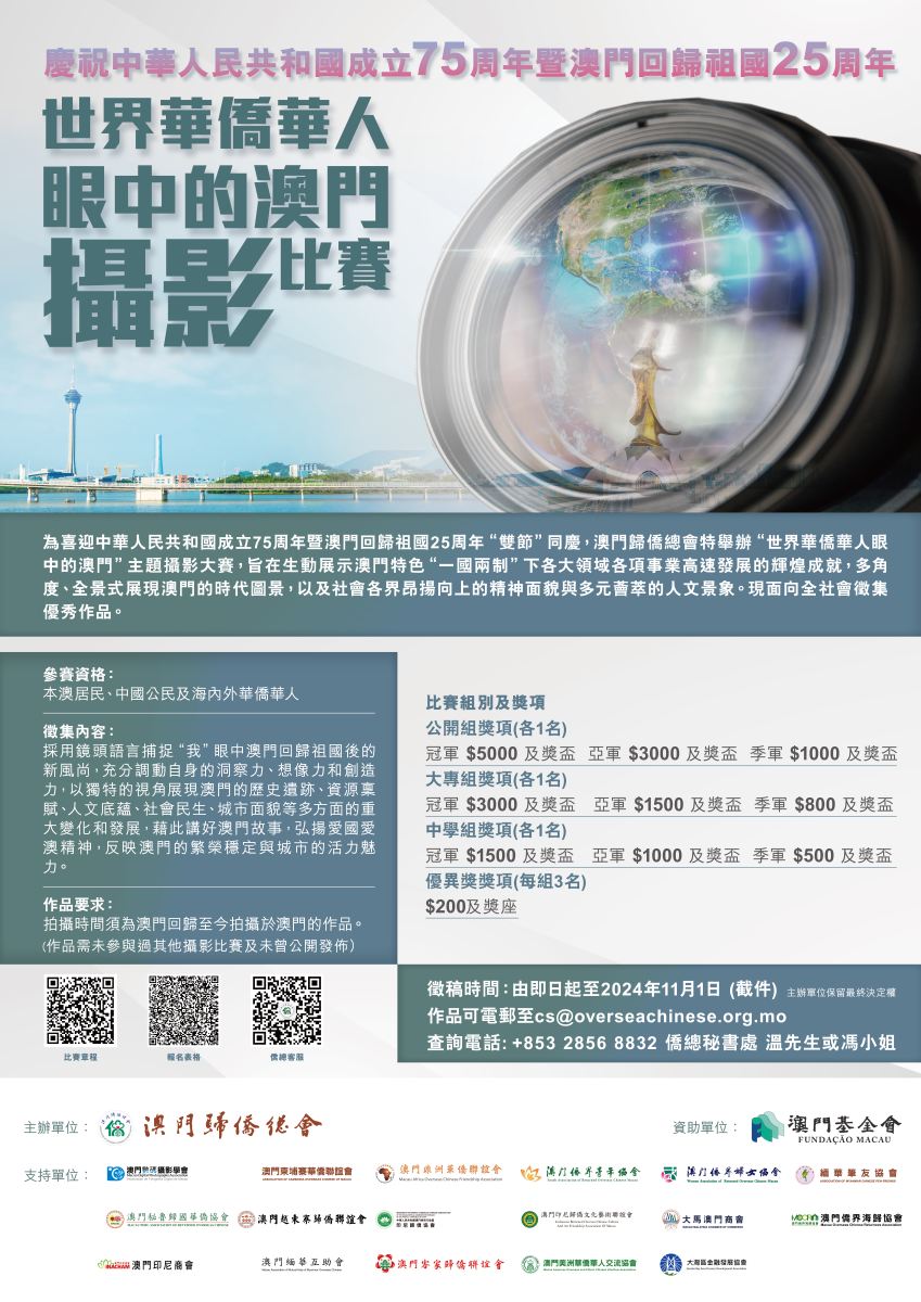 為慶祝中華人民共和國成立75周年、澳門回歸祖國25周年,由澳門歸僑總會(huì)主辦,澳門基金會(huì)資助的“世界華僑華人眼中的澳門” 攝影比賽,現(xiàn)延長徵集期至11月1日 (星期五),希望讓有興趣人士有更充分時(shí)間準(zhǔn)備作品,歡迎踴躍參與。