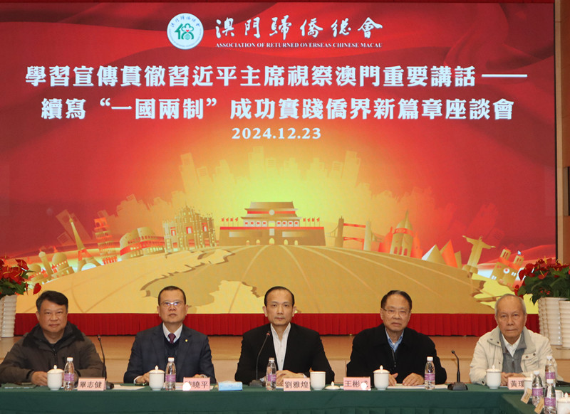 澳門歸僑總會於12月23日在僑總禮堂舉行“澳門歸僑總會學習宣傳貫徹習近平主席視察澳門重要講話,續(xù)寫‘一國兩制’成功實踐僑界新篇章座談會”,會長劉雅煌表示,習主席蒞臨澳門視察備受海內外高度關注,世界各國僑領紛紛透過僑總向澳門致以美好祝福。連日來,習主席所到之處,都受到包括僑界在內的全體澳門居民由衷歡迎,僑總會址高掛歡迎橫幅及紅旗,表達澳門僑界對習主席的擁護愛戴和最崇高的敬意。