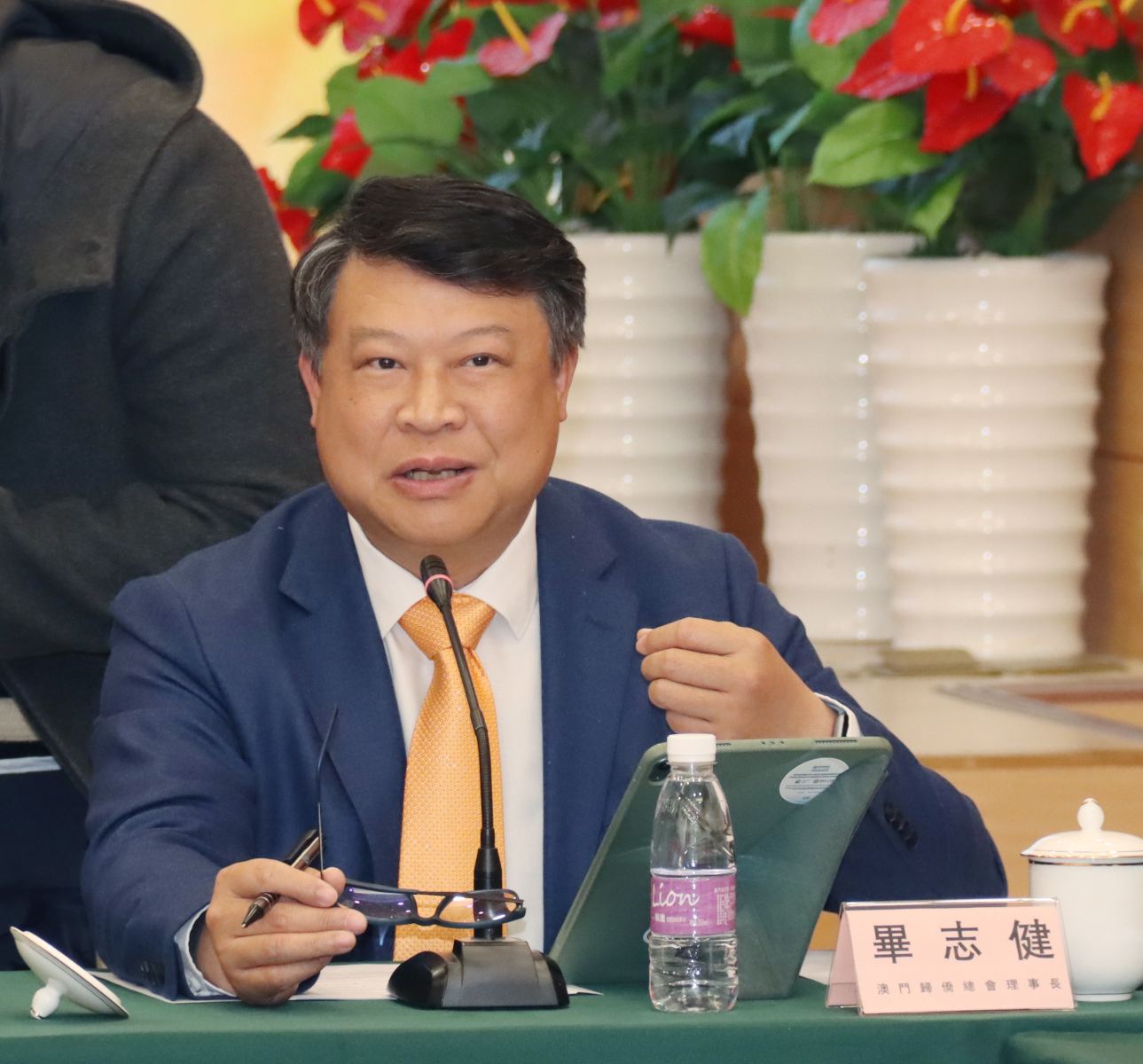 參與座談的還有行政法務(wù)司司長(zhǎng)辦公室主任林智龍、法務(wù)局局長(zhǎng)梁穎妍、市政署市政管理委員會(huì)主席周偉迎、身份證明局代局長(zhǎng)羅翩卿、行政公職局副局長(zhǎng)馮若儀,澳門歸僑總會(huì)多名副會(huì)長(zhǎng)、副理事長(zhǎng)及理監(jiān)事等。