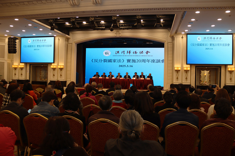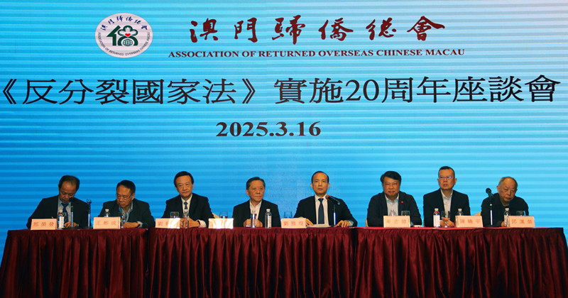 澳門歸僑總會於3月16日晚上7時假萬豪軒舉辦《反分裂國家法》實施20周年座談會,該會會長劉雅煌,永遠會長黎振強、劉藝良,監(jiān)事長王彬成分別就《反分裂國家法》實施20周年闡述己見。僑總理監(jiān)事及十五個團體會員代表等逾150人出席是次活動。僑總副會長邢榮發(fā)主持會議。