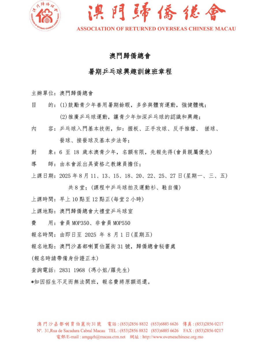 為豐富青少年暑期餘暇生活,由8月11日起將舉行僑總暑期乒乓球興趣訓(xùn)練班,即日起至8月1日可攜帶報(bào)名者身份證正本前往歸僑總會(huì)辦公室報(bào)名。詳情請(qǐng)點(diǎn)擊連結(jié)查看章程:
