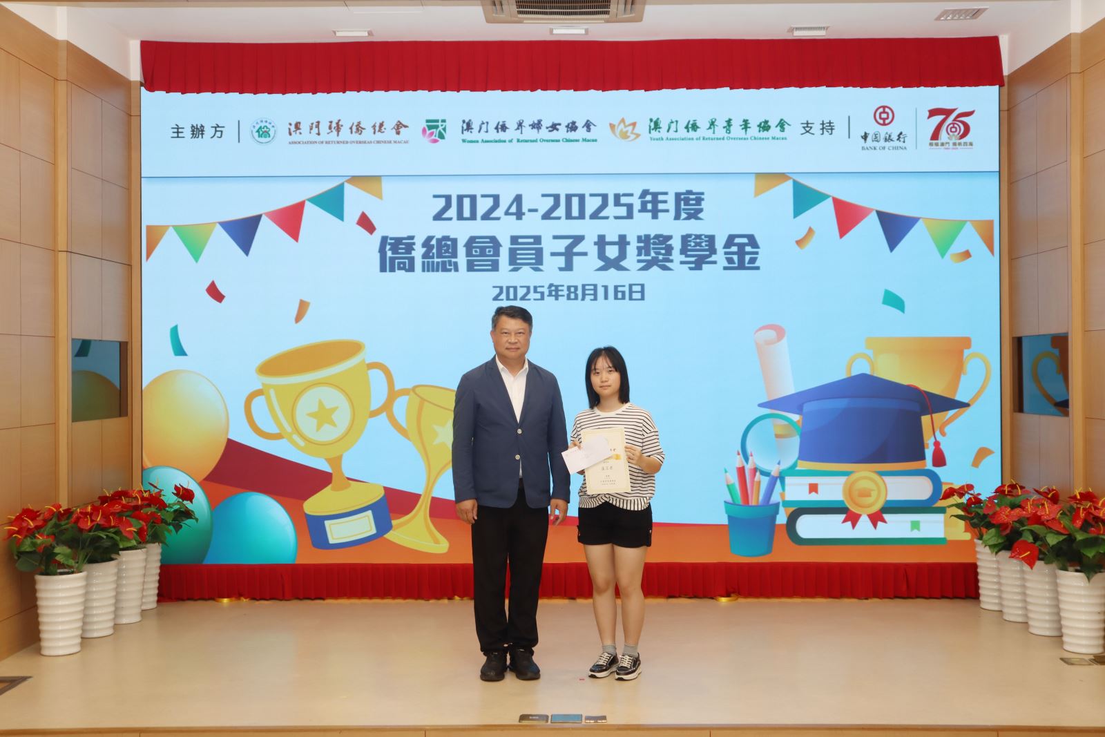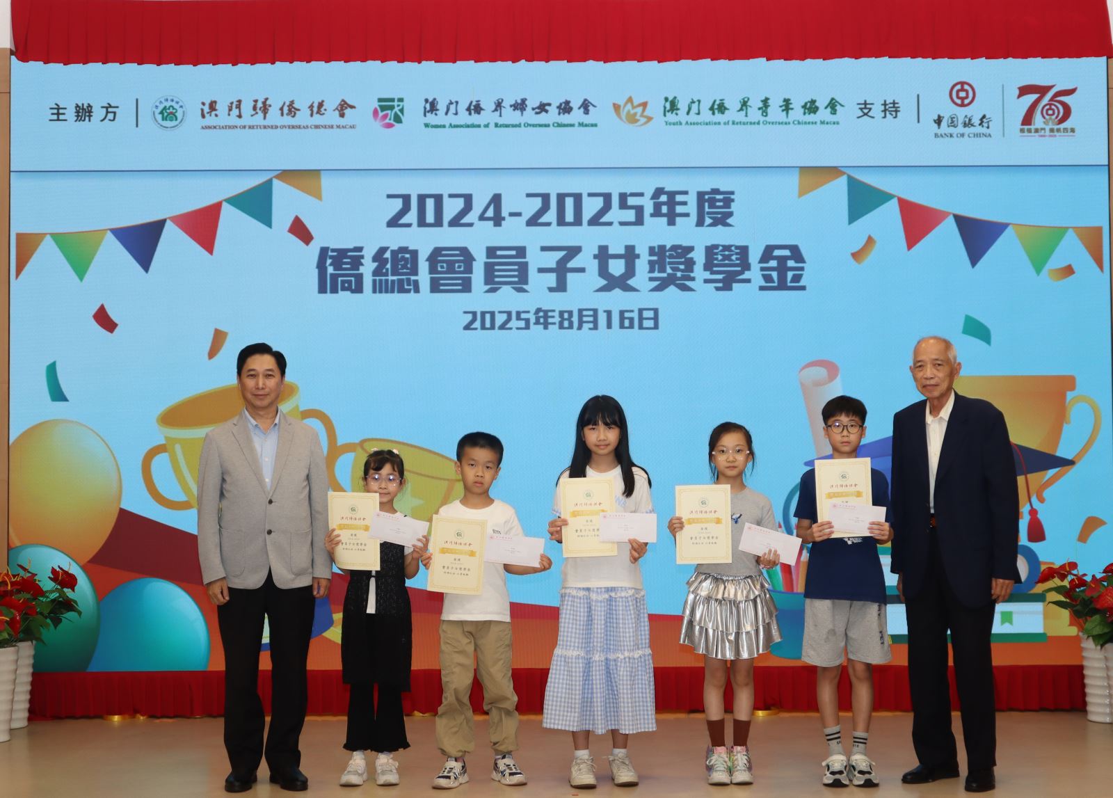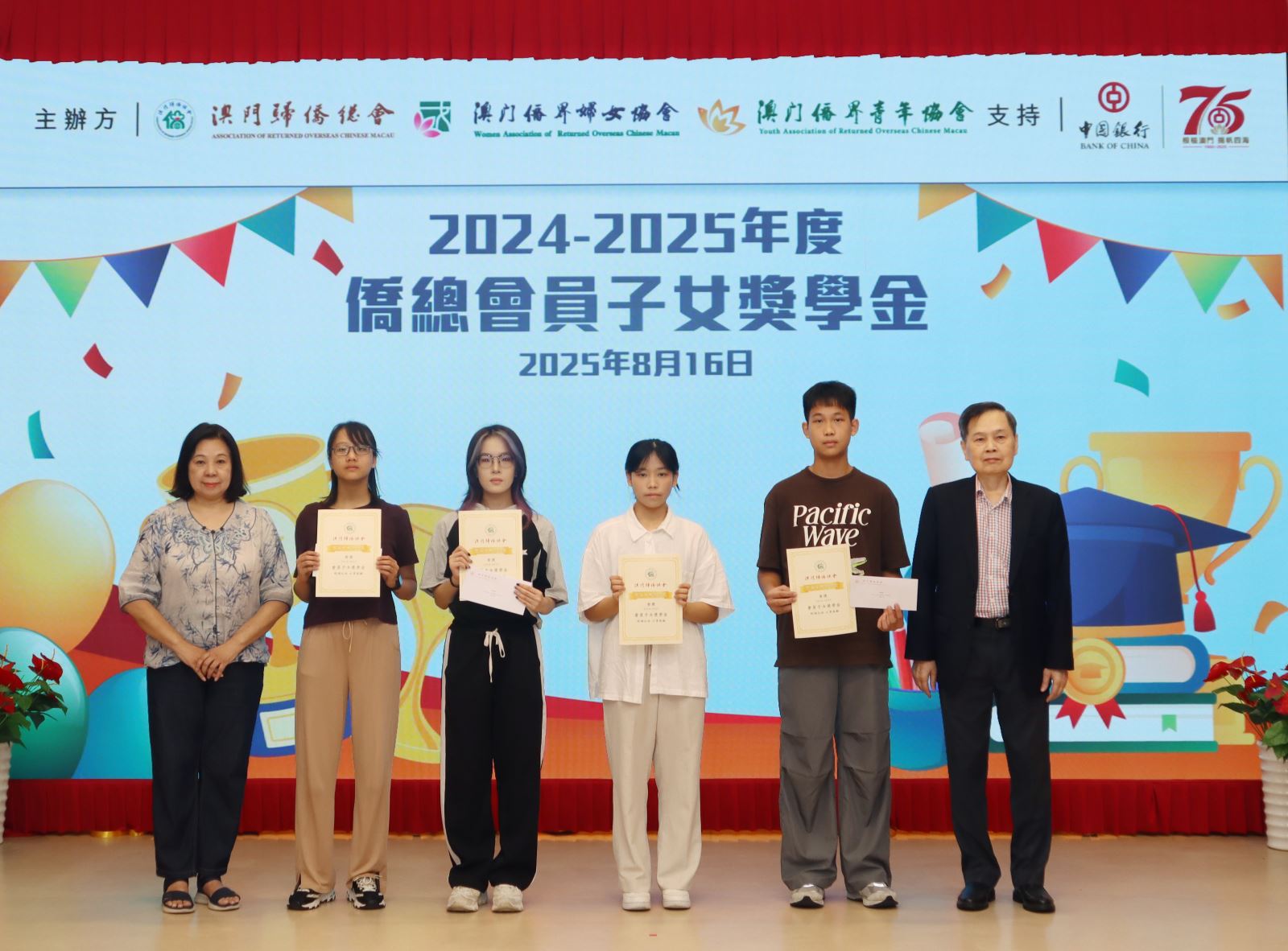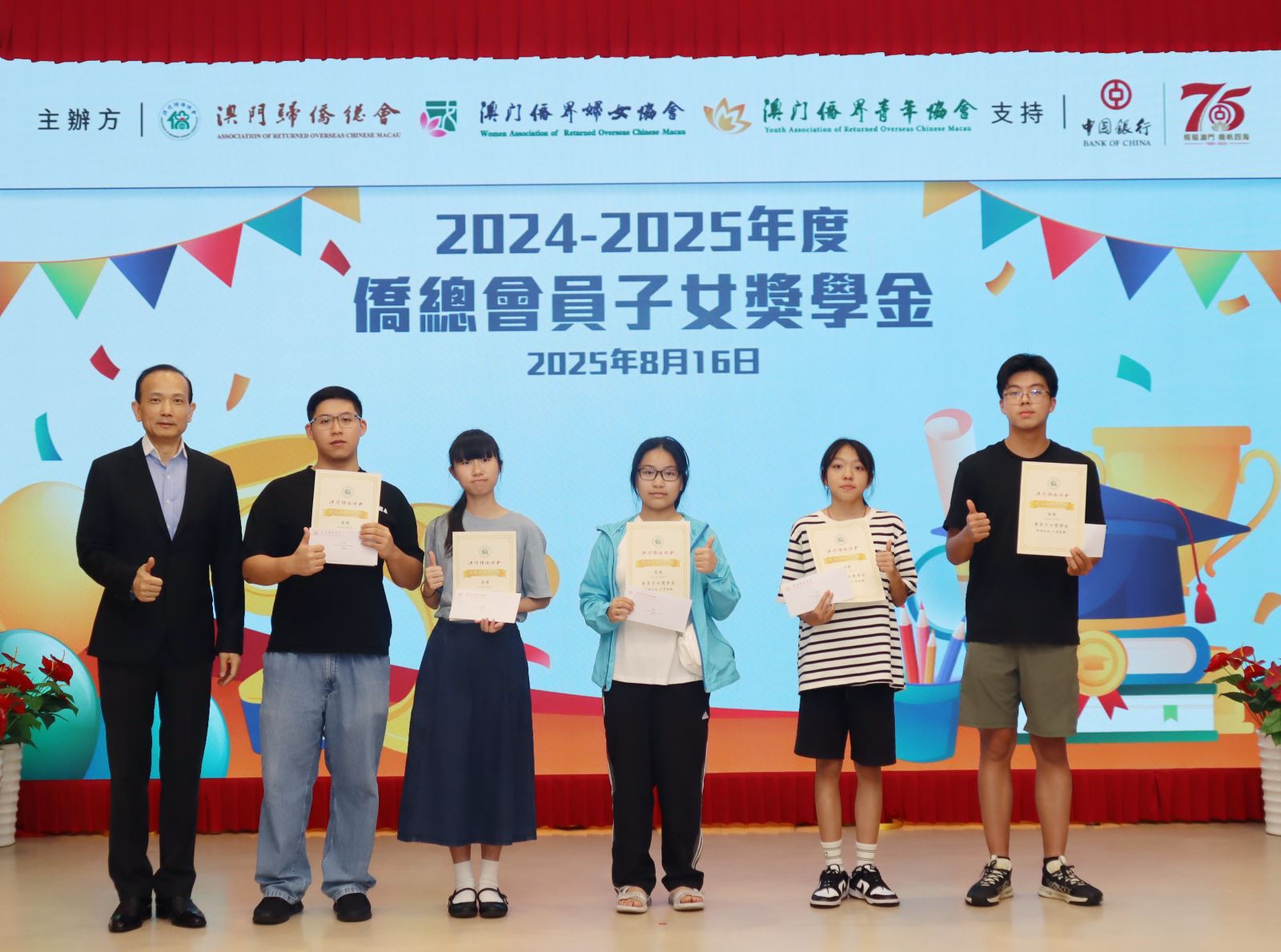 「2024-2025年度僑總會(huì)員子女獎(jiǎng)學(xué)金」頒獎(jiǎng)禮於8月16日在僑總禮堂舉行,主辦單位澳門(mén)歸僑總會(huì)長(zhǎng)劉雅煌、僑界婦女協(xié)會(huì)會(huì)長(zhǎng)鄧婉玲、僑界青年協(xié)會(huì)理事長(zhǎng)黎光豪,贊助機(jī)構(gòu)中國(guó)銀行澳門(mén)分行(俾利喇街支行)行長(zhǎng)黃一娜,僑總理事長(zhǎng)畢志健,副會(huì)長(zhǎng)陳和標(biāo)、廖麗瓊、張華、趙文炎、蔡志龍、梁鋼等出席,由僑總理事張蓓主持。