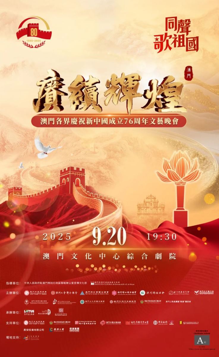 今年恰逢新中國(guó)成立76周年、紀(jì)念中國(guó)人民抗日戰(zhàn)爭(zhēng)暨世界反法西斯戰(zhàn)爭(zhēng)勝利80周年、冼星海誕辰120周年以及《七子之歌》發(fā)表100周年,在這一系列具有里程碑意義的節(jié)點(diǎn)交織時(shí)刻,澳門各界精心準(zhǔn)備了“賡續(xù)輝煌——澳門各界慶祝新中國(guó)成立76周年文藝晚會(huì)”,全面展示澳門近年來(lái)的藝術(shù)成果,彰顯澳門文化藝術(shù)的繁榮發(fā)展,激發(fā)澳門同胞的愛國(guó)熱情。