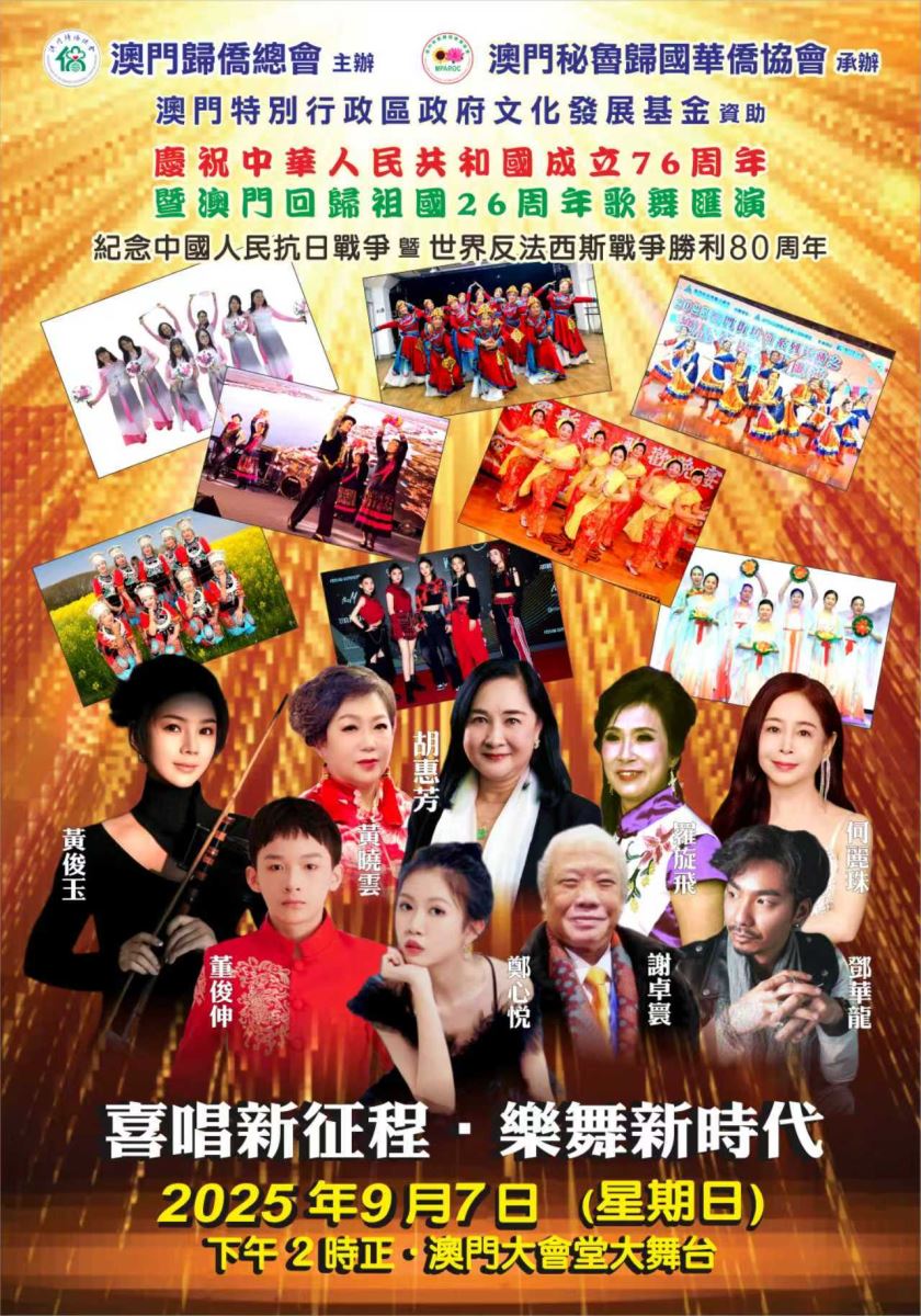 為慶祝中華人民共和國成立七十六周年、澳門回歸祖國二十六周年,同時(shí)配合特區(qū)政府構(gòu)建以“中華文化為主流,多元文化共存”交流合作基地的施政,由澳門歸僑總會(huì)主辦,澳門秘魯歸國華僑協(xié)會(huì)承辦,澳門文化發(fā)展基金資助的“喜唱新征程?樂舞新時(shí)代”澳門僑界慶澳門回歸26周年之愛國愛澳歌舞大匯演將於9月7日(星期日)下午2時(shí),假澳門大會(huì)堂大舞臺(tái)隆重舉行。傳承僑界“愛國愛澳愛僑愛鄉(xiāng)”之優(yōu)良傳統(tǒng),延續(xù)情系桑梓的美好品格。僑界愛國愛澳大匯演結(jié)合本澳與內(nèi)地僑鄉(xiāng)的各表演者,共同歌頌與舞出對(duì)國家、對(duì)澳門的“僑心僑情”,增加澳門市民對(duì)僑鄉(xiāng)文化的認(rèn)識(shí),促進(jìn)澳門多元交化交流,活動(dòng)融入歌舞匯演等形式,開展具有僑特色的多元人文交流,凝聚僑心,相互促進(jìn),共譜愛國愛澳愛僑的美好樂章。