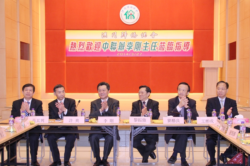 3月27日,澳門中聯(lián)辦主任李剛,協(xié)調(diào)部部長許爽,協(xié)調(diào)部部長級(jí)助理高其興,協(xié)調(diào)部副部長史學(xué)林,協(xié)調(diào)部處長余向軍,李剛主任秘書徐磊一行到訪僑總,與僑總會(huì)長黎振強(qiáng),常務(wù)副會(huì)長劉藝良,理事長王彬成,監(jiān)事長康寧英,永遠(yuǎn)會(huì)長梁仲虯、盧學(xué)鋒,副會(huì)長邱漢榮、黃瓊成、畢明、劉雅煌、陳健英、許國璇、梁寳卿、謝思訓(xùn)、勞灼榮、張志民、溫深文、陳振豪等座談。在兩個(gè)多小時(shí)的交流中,雙方就有關(guān)澳門的社情、僑情的問題,廣泛交換了意見。