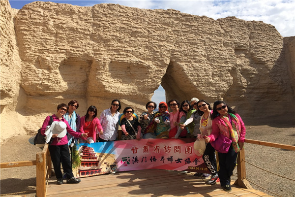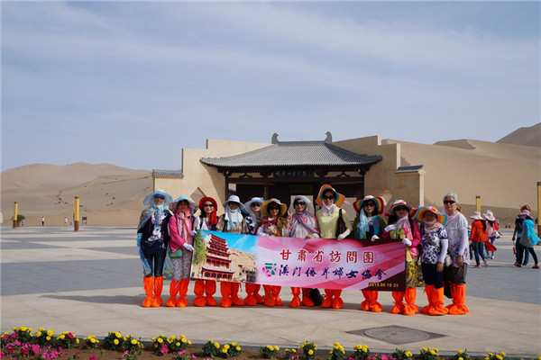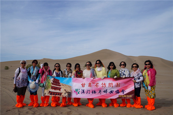日前,澳門(mén)僑界婦女協(xié)會(huì)會(huì)長(zhǎng)梁美滿、常務(wù)副會(huì)長(zhǎng)洪華率12人代表團(tuán)往“絲綢之路”重地甘肅省實(shí)地考察,期間參觀訪問(wèn)了嘉峪關(guān)城樓、雙塔小庫(kù)、鳴沙山月牙泉、莫高窟、玉門(mén)關(guān)、漢長(zhǎng)城、雅丹國(guó)家地質(zhì)公園等。