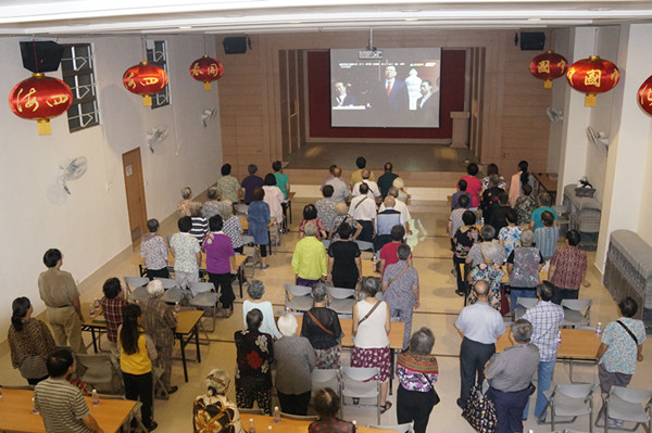 歸僑總會(huì)組織約七十名會(huì)員在會(huì)址禮堂觀看閱兵直播。副會(huì)長(zhǎng)梁美滿表示,作為僑界社團(tuán),該會(huì)有很多年長(zhǎng)的會(huì)員都是經(jīng)歷過(guò)抗日戰(zhàn)爭(zhēng)的艱苦歲月,今天在這裡觀看閱兵儀式,他們激動(dòng)的心情難以言表。七十年前國(guó)家和人民為反法西斯主義和抗日侵略,全力以赴投入戰(zhàn)爭(zhēng),是民族的驕傲,歷史的豐碑。