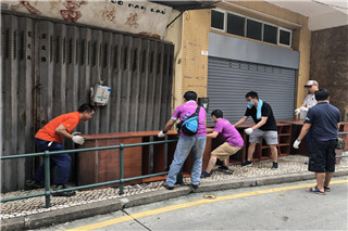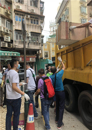 澳門歸僑總會響應(yīng)澳門特區(qū)政府的清障行動(dòng),召集了近百人的僑界社團(tuán)義工,於9月17日在澳門不同的受災(zāi)區(qū),逐家逐戶,呼籲民眾清理受浸雜物, 協(xié)助受困商戶或居民清理積水雜物,移防街道垃圾。