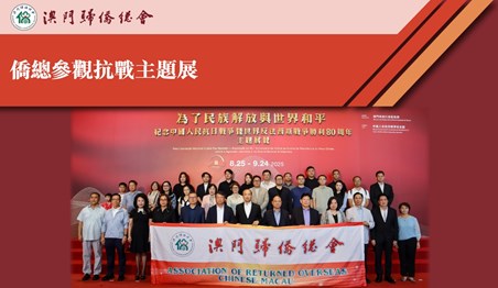 澳門歸僑總會會長劉雅煌、理事長畢志健、監(jiān)事長王彬成帶領(lǐng)近五十位理監(jiān)事,於日前在中葡綜合體參觀“紀(jì)念中國人民抗日戰(zhàn)爭暨世界反法西斯戰(zhàn)爭勝利80周年展覽”,藉此了解抗戰(zhàn)歷史,傳承和弘揚(yáng)愛國愛澳的優(yōu)良傳統(tǒng)。
