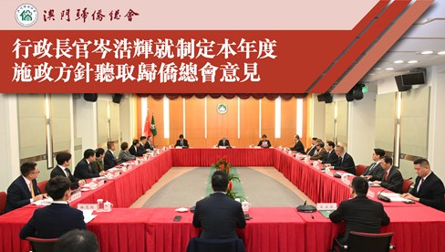 行政長官岑浩輝2月21日在政府總部與澳門歸僑總會一行座談,就編製本年度施政報告聽取該會的意見及建議。